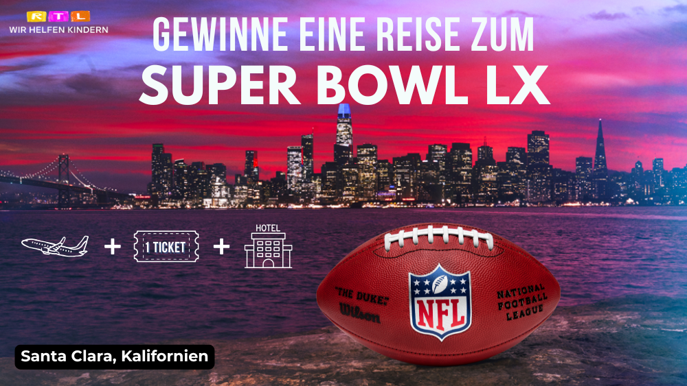 Mit Deiner Spende zugunsten der Stiftung RTL – Wir helfen Kindern hast Du jetzt die Chance, eine Reise nach USA inklusive 1 Ticket für den Super Bowl LX zu gewinnen!